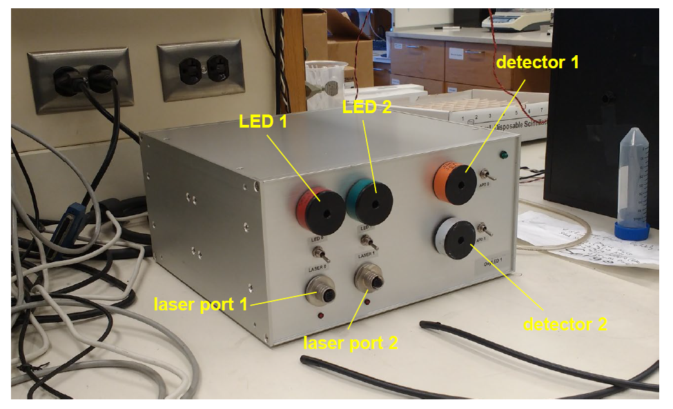 仪器有两个激发通道和两个检测器。在每个通道中,激发可以在LED和激光二极管组件之间切换。后者允许聚焦到直径约200μm的光点。通道可以配置为具有相同颜色或不同颜色的LED /激光。具有两种不同的颜色可以使用两个探针进行实验,例如PtG4和PtR4,即使探针存在于同一介质中,也可以独立测量其信号。